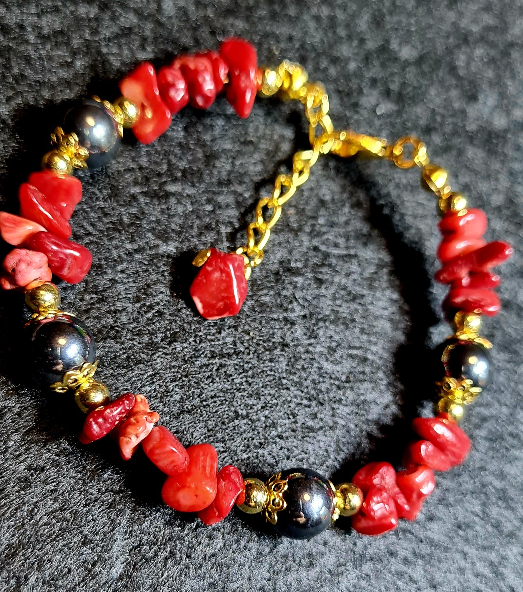 Il diaspro rosso, pietra di protezione, stabilità e coraggio insieme all'ematite , pietra energizzante che infonde coraggio e fiducia in sé stessi, formano un braccialetto perfetto sia nelle proprietà sia nei colori.